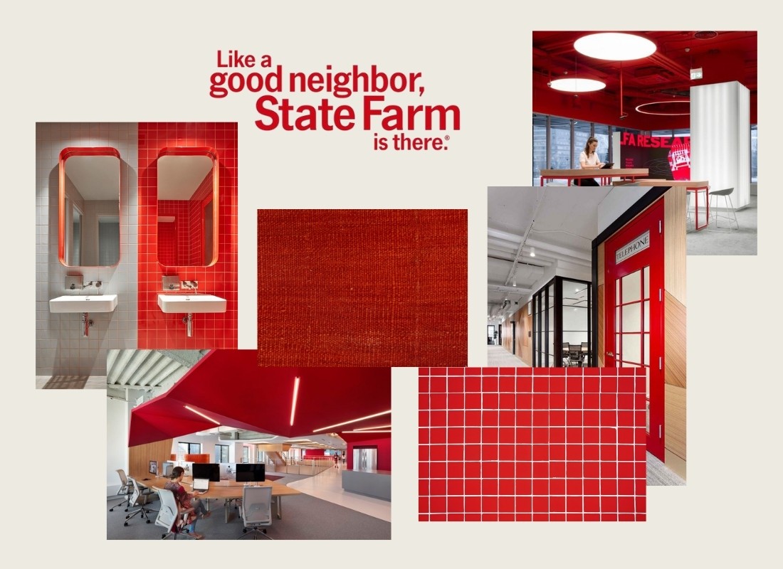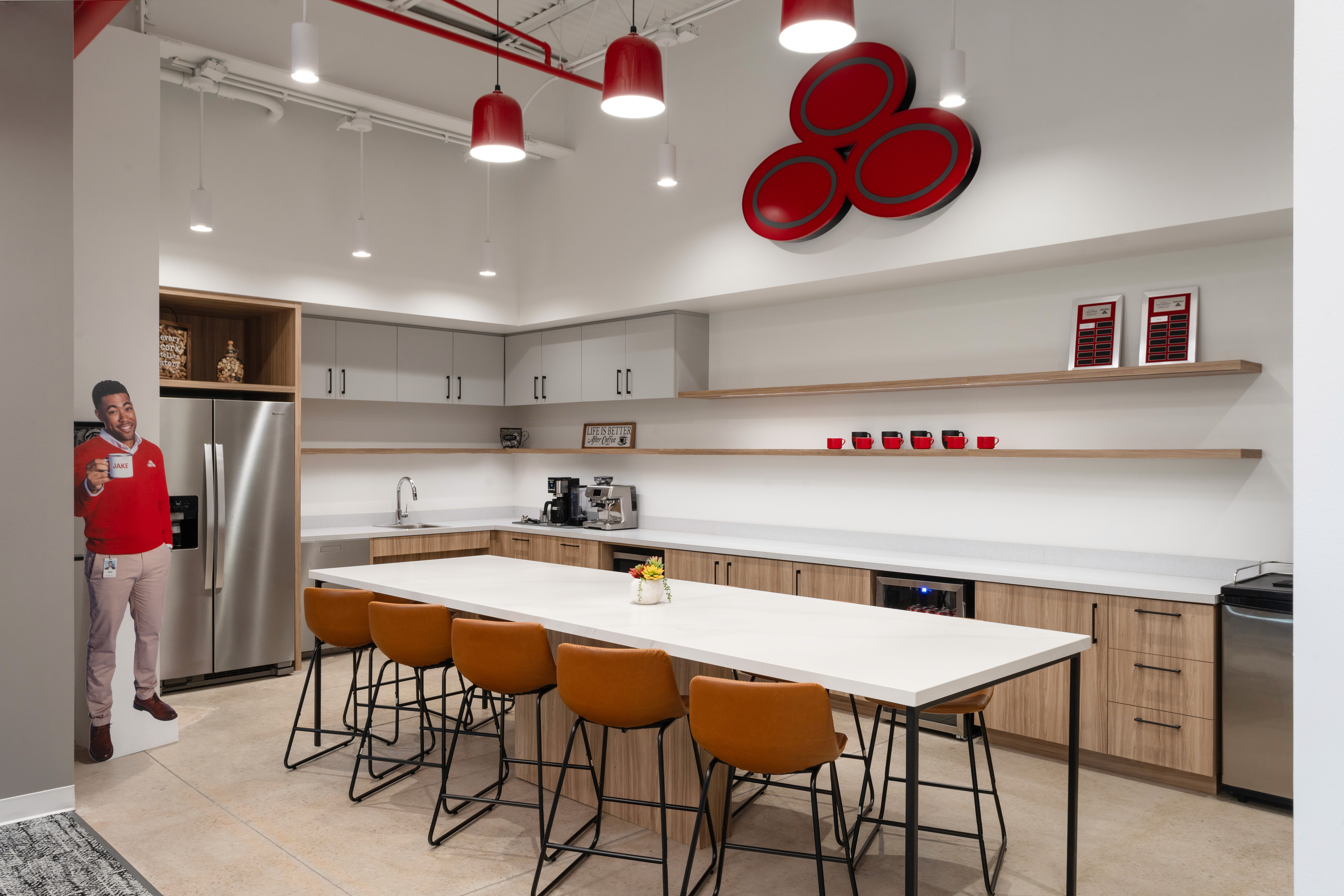 In the break room, the design shifts into a softer mode, still aligned with the brand while feeling warm, approachable, and inviting. Red appears in playful accents through pendant lights, dishware, and the iconic State Farm symbol, adding personality without overwhelming the space. Natural wood tones and clean white surfaces balance the palette, creating a calm backdrop for conversation, coffee, and the small pauses that keep a workday moving.